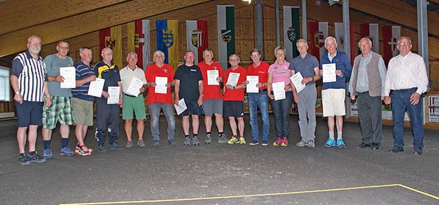 Bad Mitterndorf - Bezirksmeisterschaft Steir. Seniorenbund R1-5 2019 v.li.: Schiedsrichter Werner Schwaiger, Rang 2: Wörschach, Sieger Bad Mitterndorf: Johann Aster, Gernot Schlömmer, Franz Egger, Siegfried Danklmaier, Rang 3: Schladming, Sportreferent Sepp Raich, Bezirksobmann Seniorenbund Erich Zeiringer